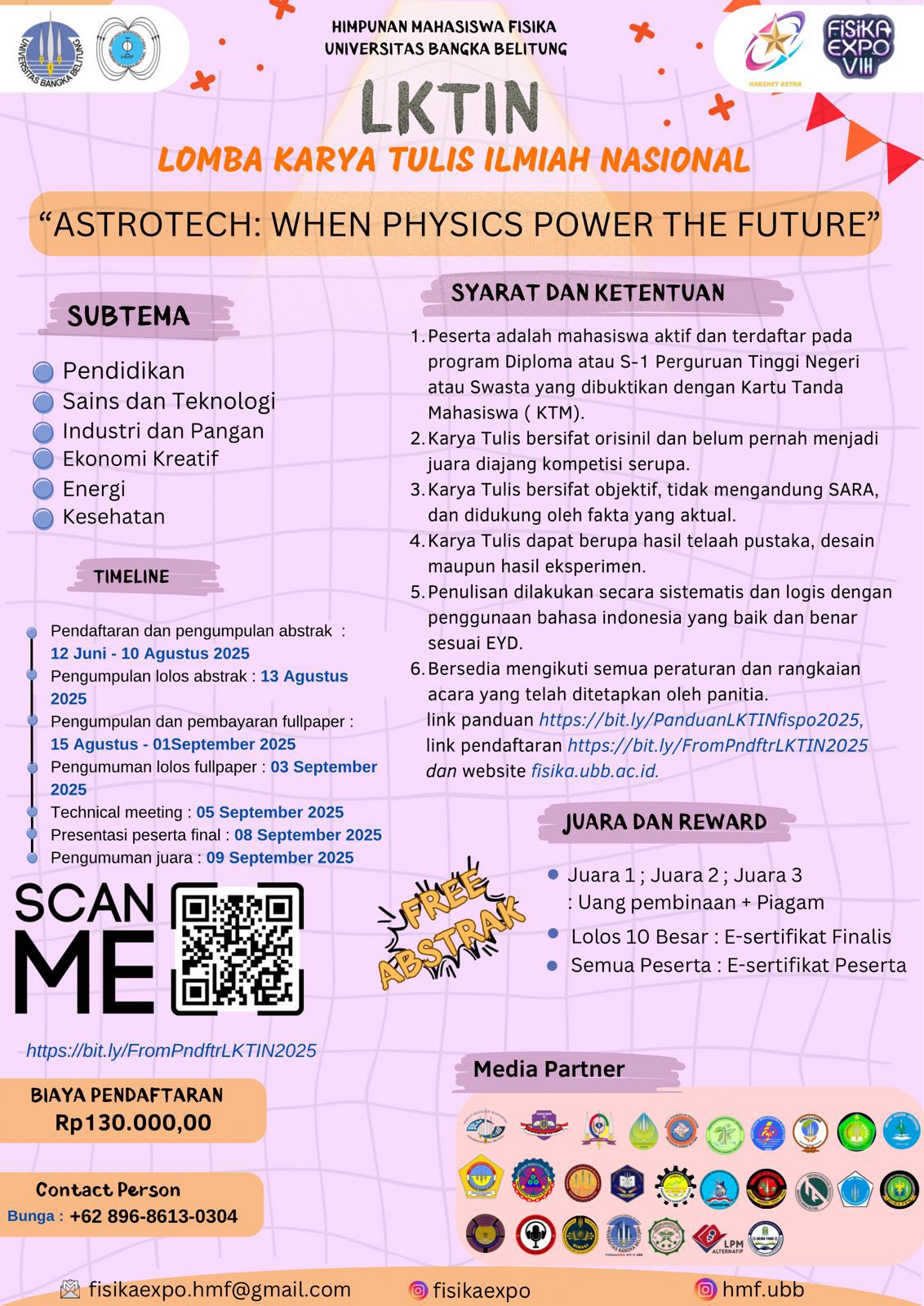 Himpunan Mahasiswa Fisika Universitas Bangka Belitung kembali menyelenggarakan Lomba Karya Tulis Ilmiah Nasional (LKTIN) sebagai bagian dari rangkaian kegiatan Fisika Expo VIII. Kompetisi ini ditujukan bagi mahasiswa tingkat diploma dan sarjana dari seluruh perguruan tinggi di Indonesia untuk menyalurkan ide, inovasi, dan solusi berbasis sains dan teknologi.
