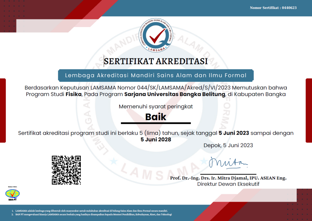 Sejak tanggal 5 Juni 2023 - 5 Juni 2028 Prodi Fisika Memenuhi syarat peringkat Baik